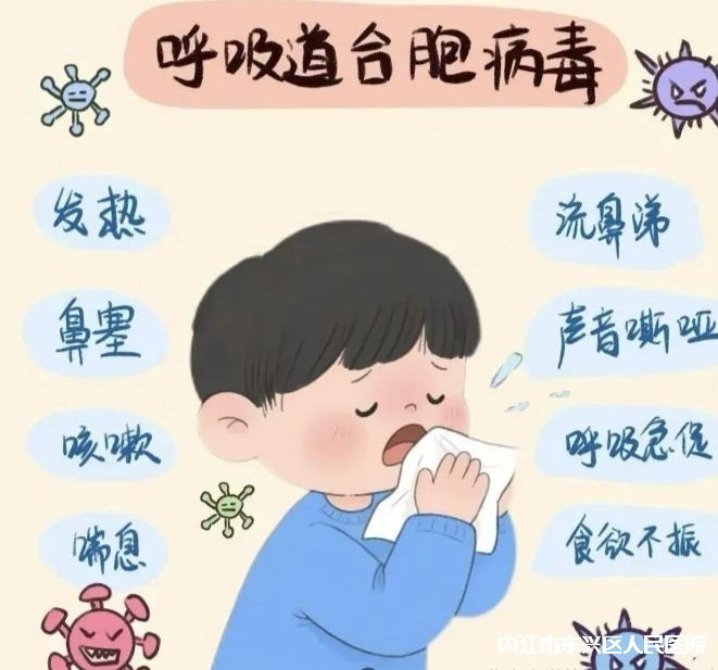 常见症状和表现:1.上呼吸道:发热、鼻塞、流涕、频繁咳嗽、声音嘶哑、眼睛发红(结膜炎),部分孩子可能引发中耳炎,出现哭闹、抓耳朵等表现;2.下呼吸道:喘息(呼吸时发出“喉鸣”或“哨笛音”)、呼吸急促(安静状态下婴儿每分钟呼吸超50次)、呼气费力(肋骨间或锁骨上凹陷)、吃奶时因呼吸不畅导致喂养困难,严重时可能引发毛细支气管炎、肺炎;
