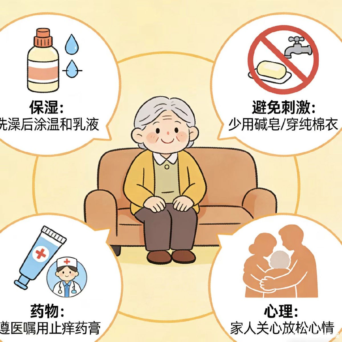 心理调节:瘙痒可能会让人烦躁不安,甚至影响睡眠。家人要多关心老人,帮助他们放松心情,避免过度焦虑。